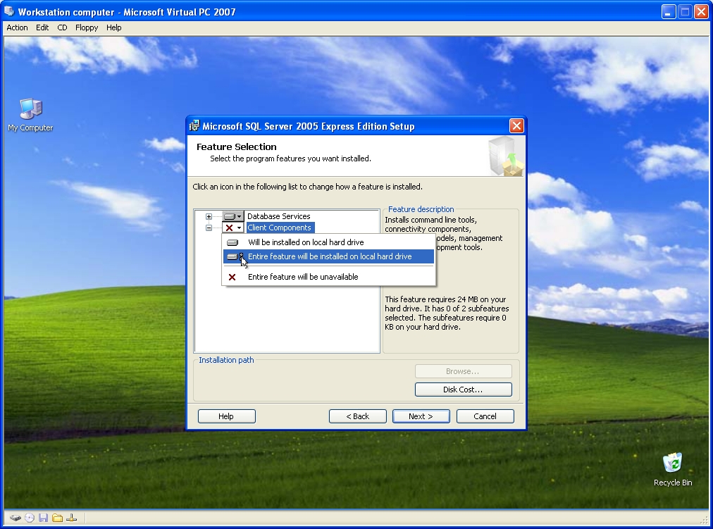 Select “Client components”, then select “Entire feature will be installed…”, and then click next to continue.