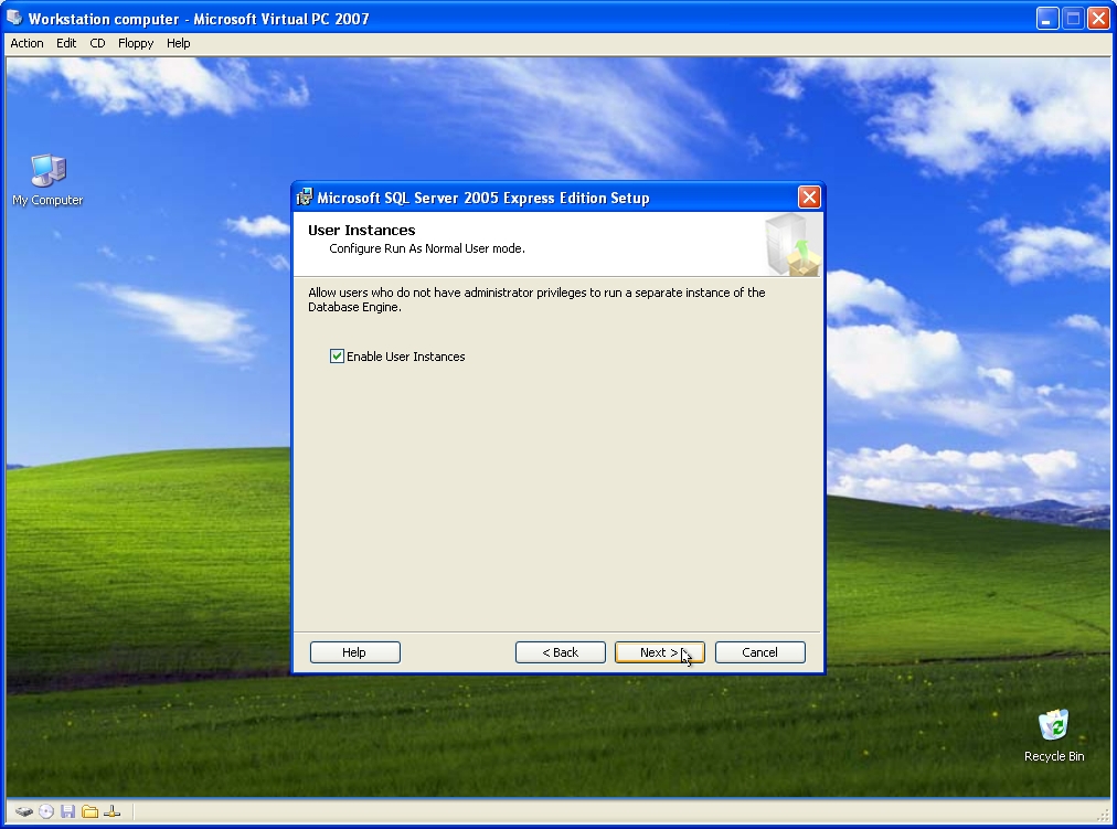 The program is now ready to install “Microsoft SQL Server 2005 Express”. Click next to continue.