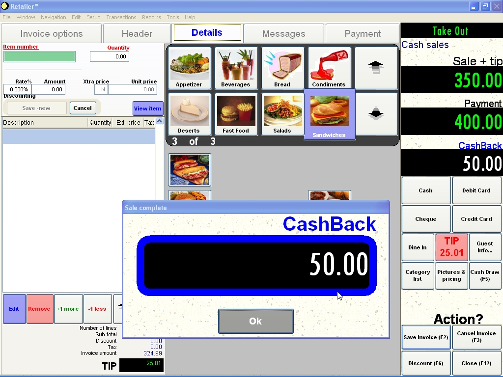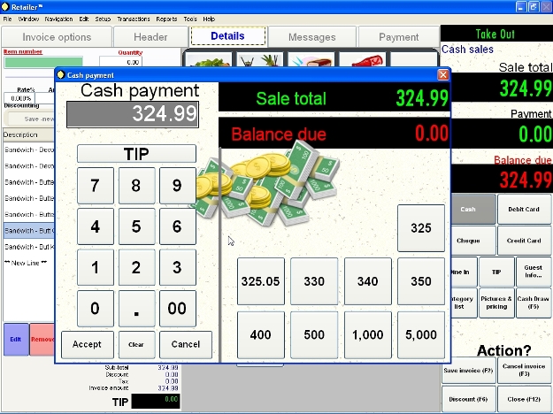 Collect customer payment using any mix of cash, foreign currency, and debit card and so on.
