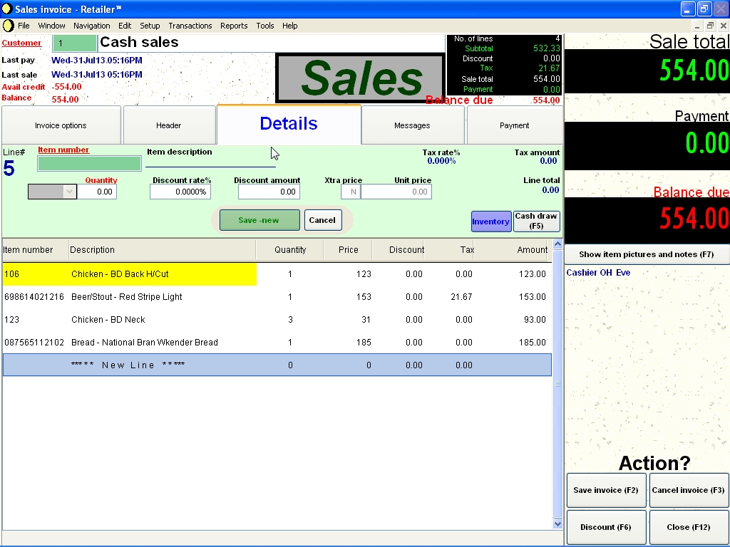 Invoice sales screen to create customer cash sale, credit sale. Create a new invoice from quote or a previous invoice.