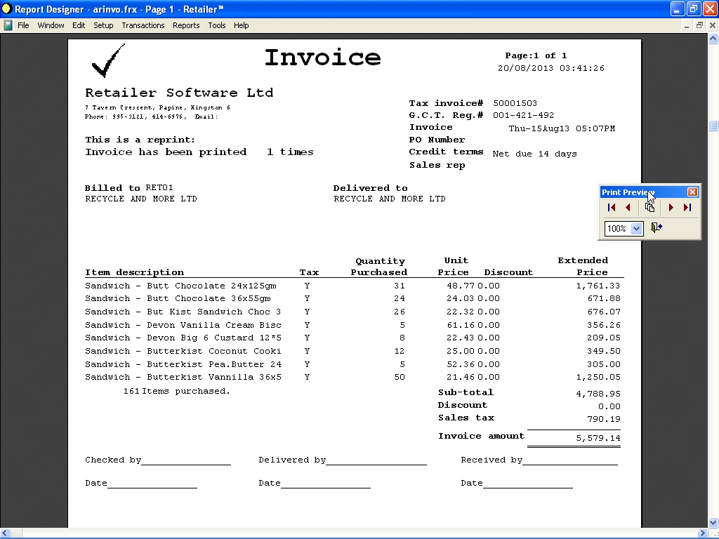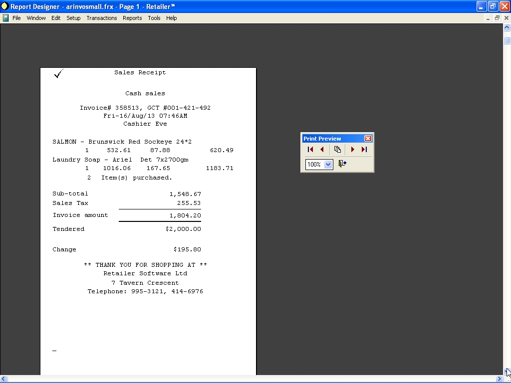 A customizable invoice being printed on 4” wide continuous ticket roll.